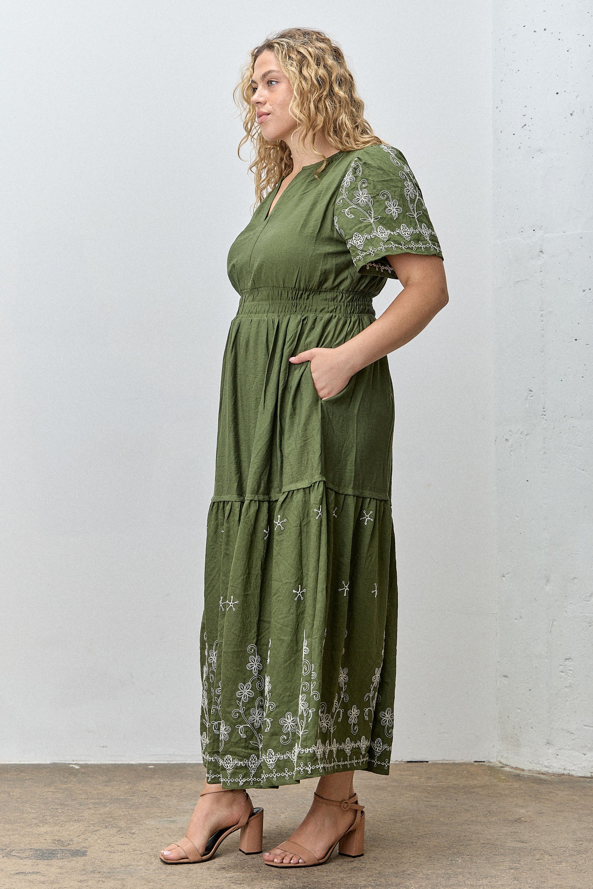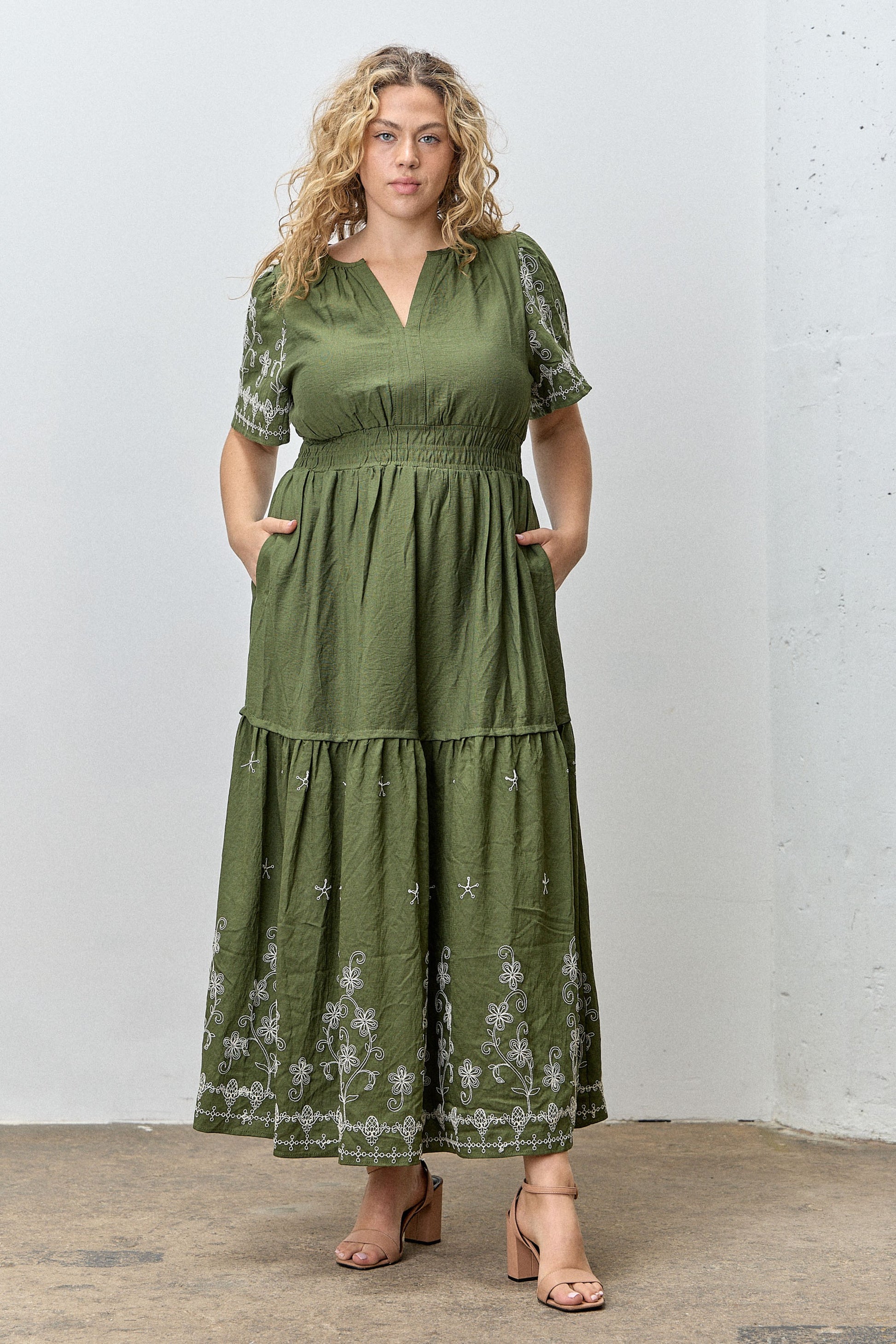 The Birdy Dress features delicate floral embroidery that enhances its feminine appeal. Designed with a flattering V-neck and a tiered skirt, it offers graceful movement and a sophisticated silhouette. An elastic waist ensures comfort and ease of fit, while convenient side pockets add practical functionality. This dress combines elegant detailing with everyday wearability, making it a versatile addition to your wardrobe.