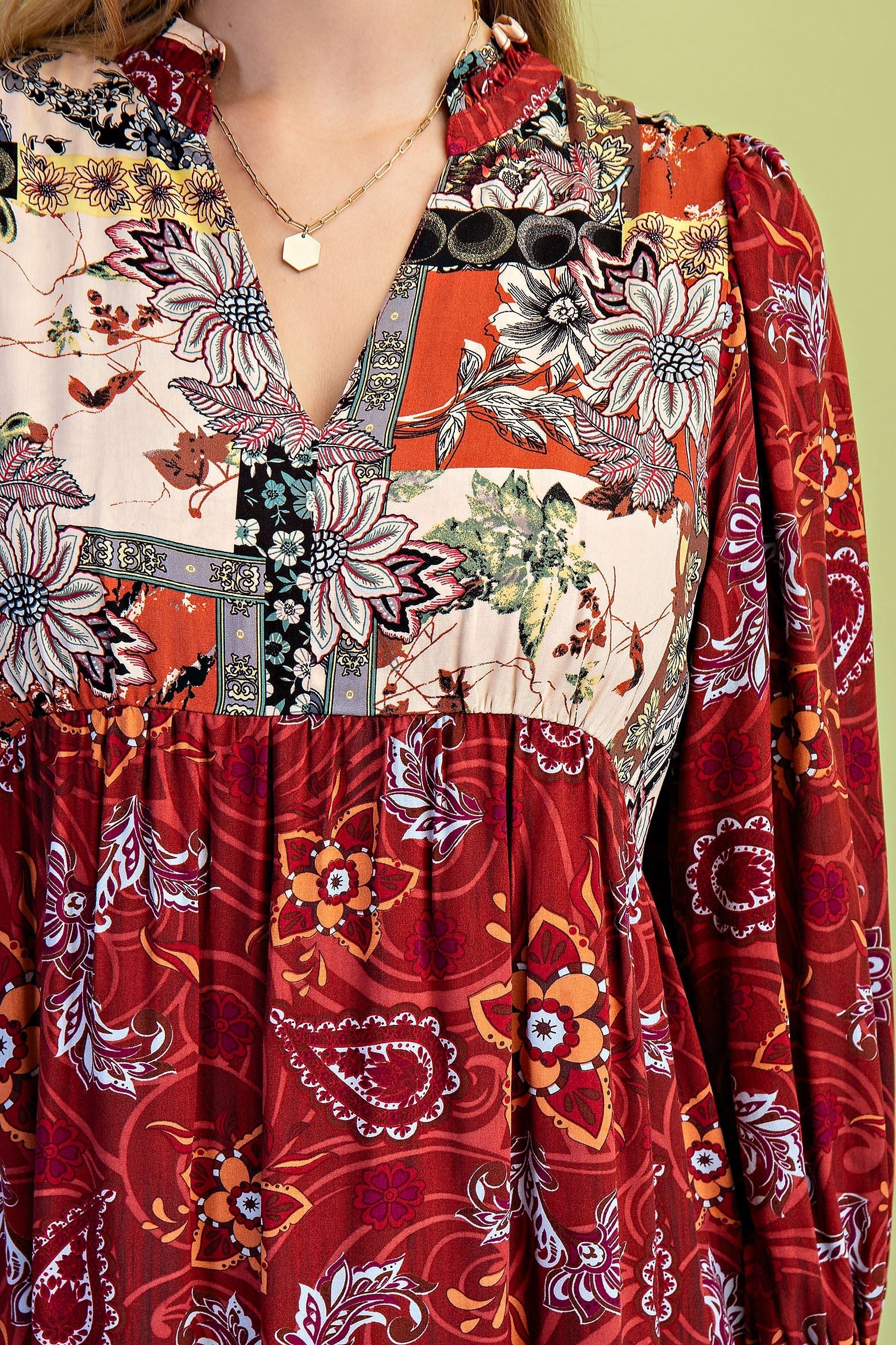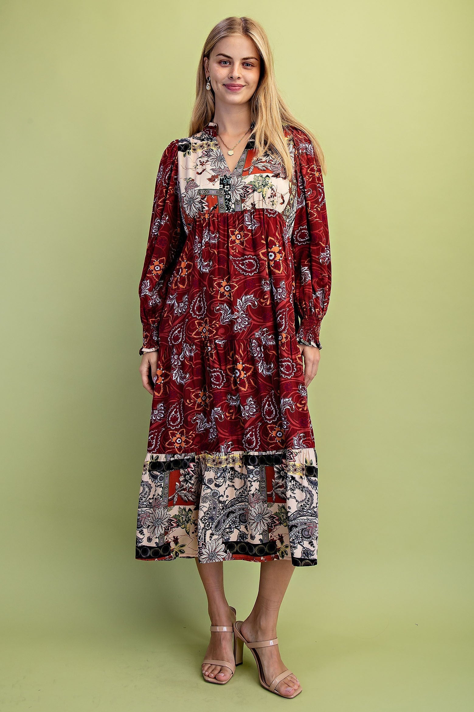 The Camila Dress features a sophisticated mixed print design and a flattering tiered silhouette that flows into a midi length. Its V-neckline is elegantly accentuated by delicate ruffling, adding subtle texture and charm. This dress combines style and comfort, making it an ideal choice for both casual outings and more polished occasions.