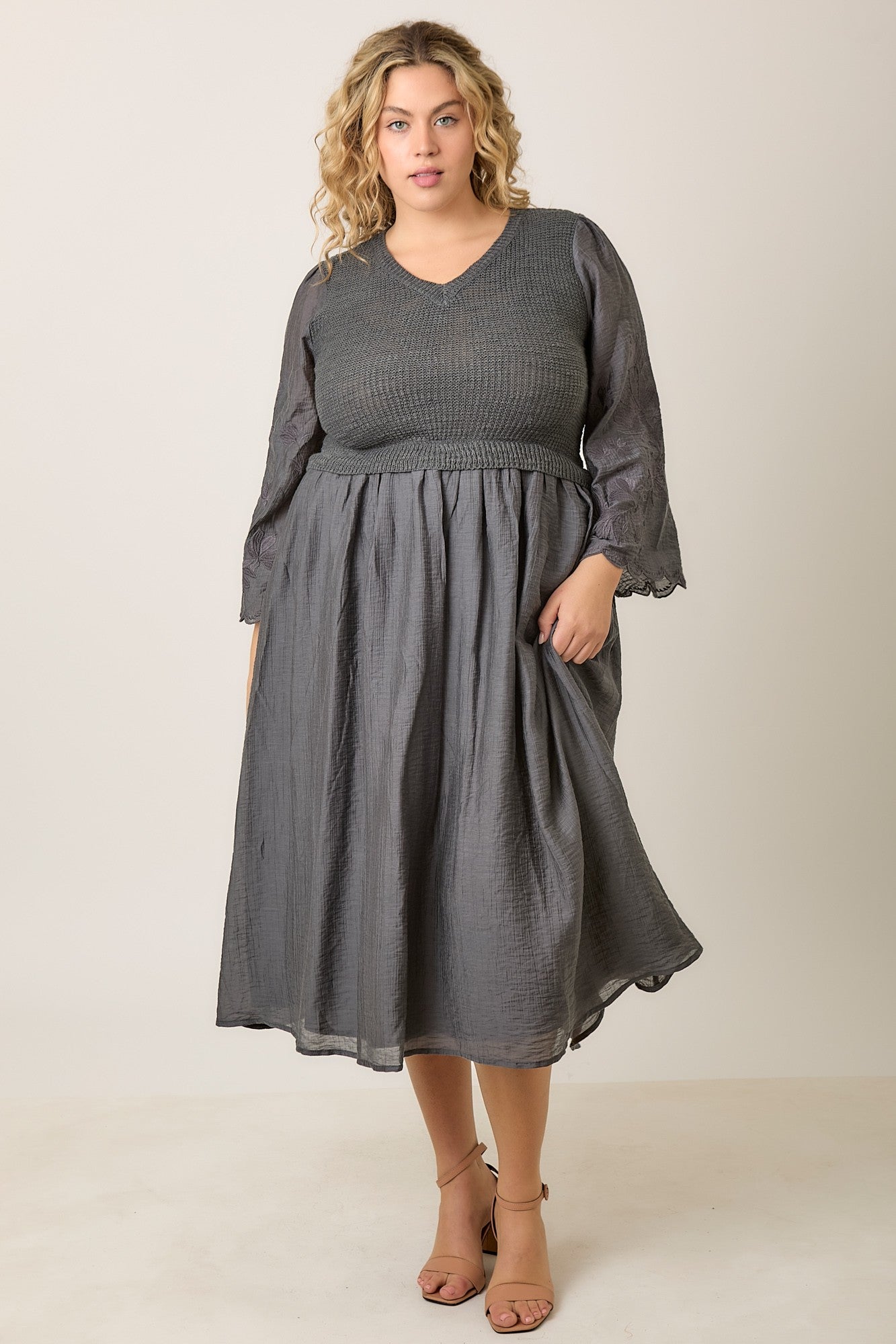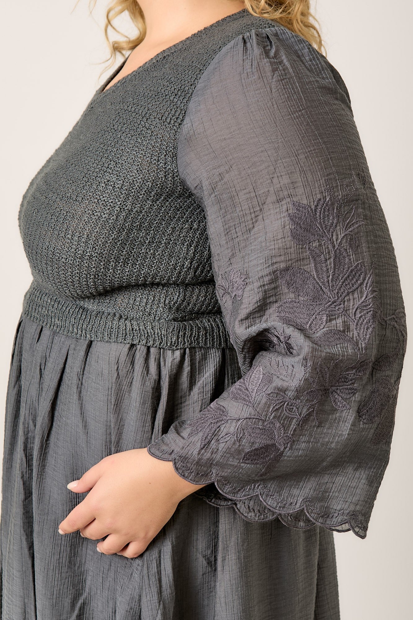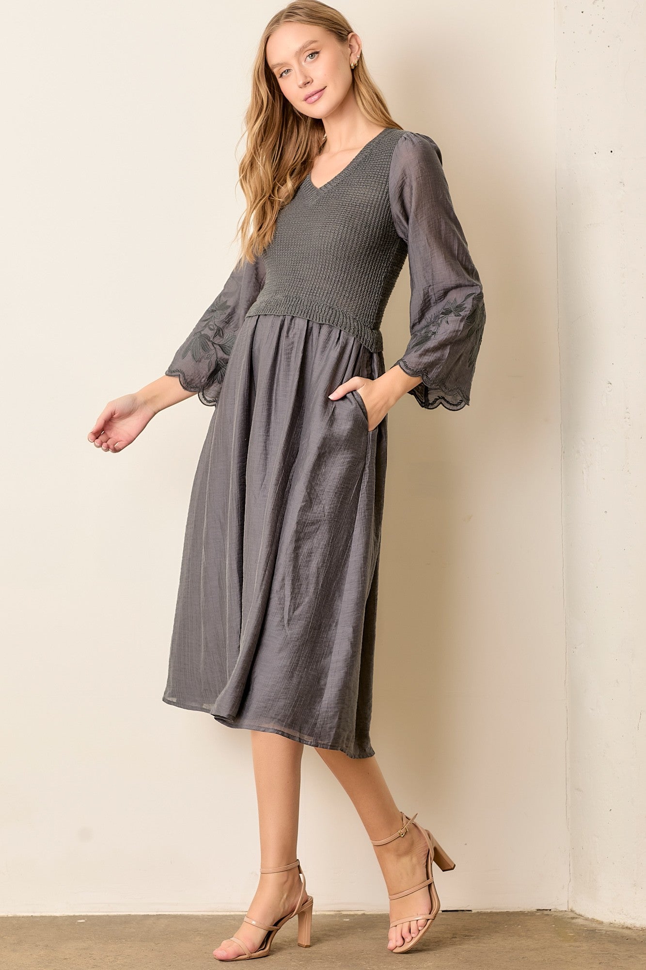 The Cynthia Dress combines comfort and style with its sweater mix fabric and elegant embroidery. Featuring a flattering V-neck and long sleeves, this dress offers both warmth and sophistication. Practical pockets add convenience, making it an ideal choice for versatile wear throughout the seasons.