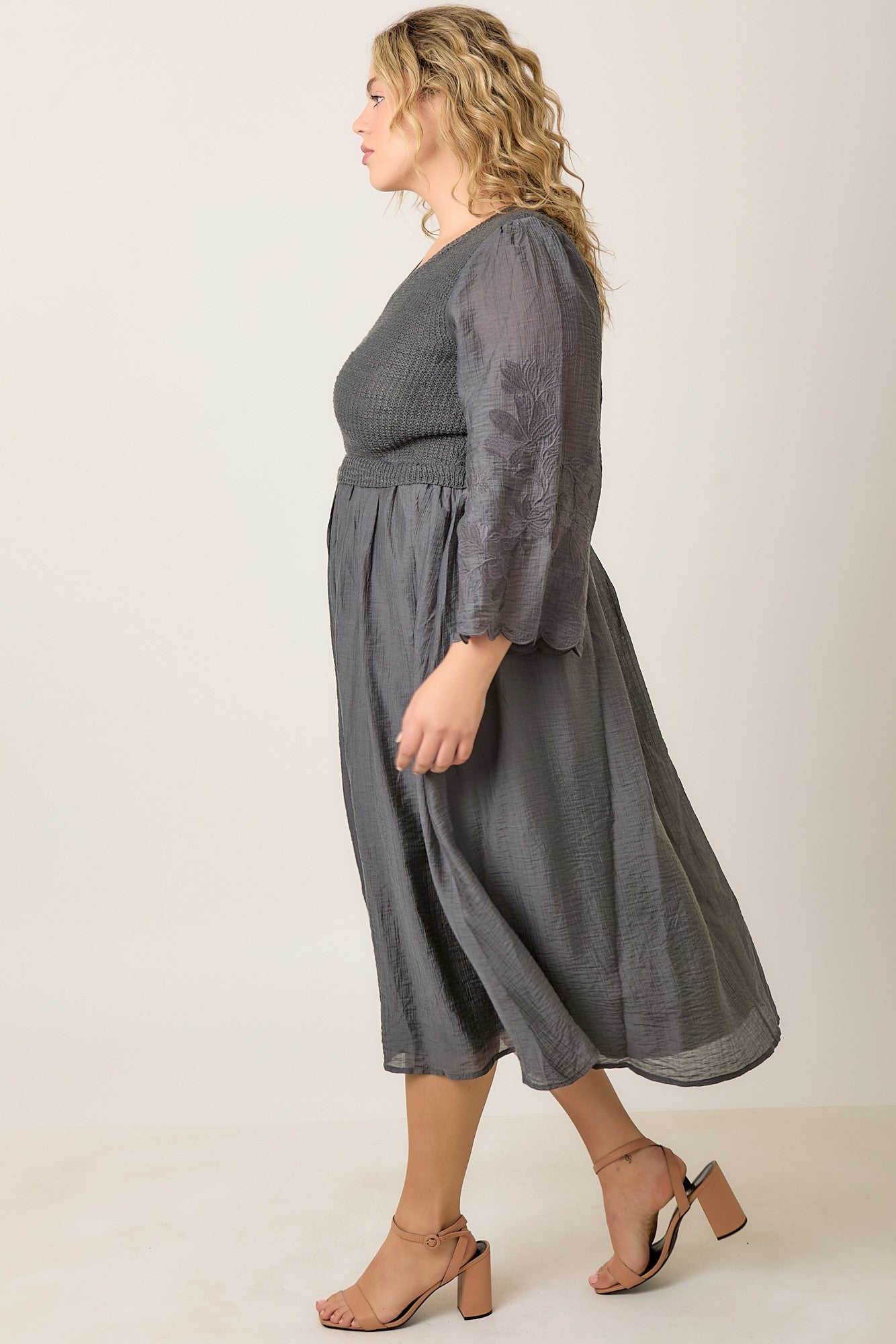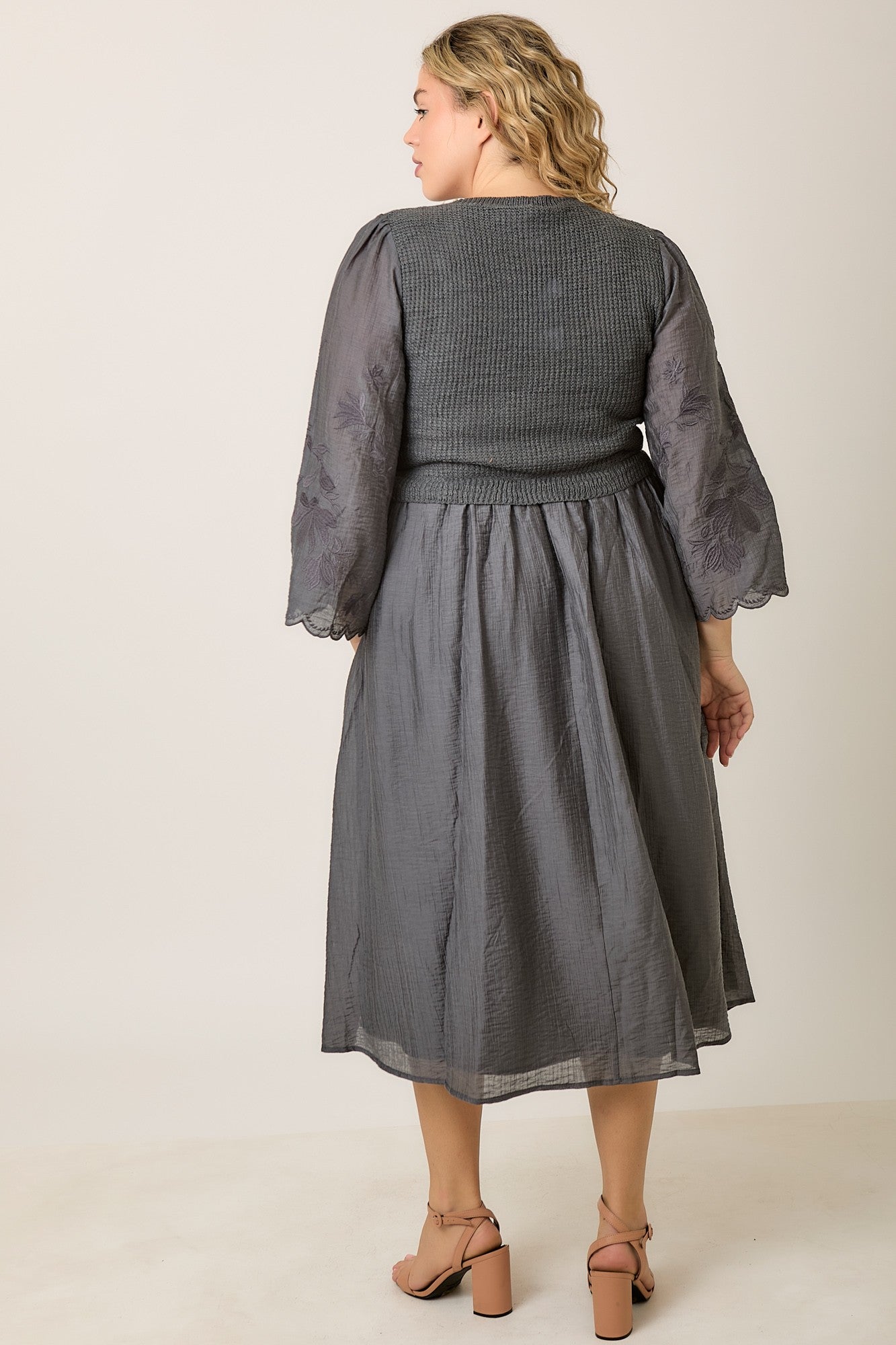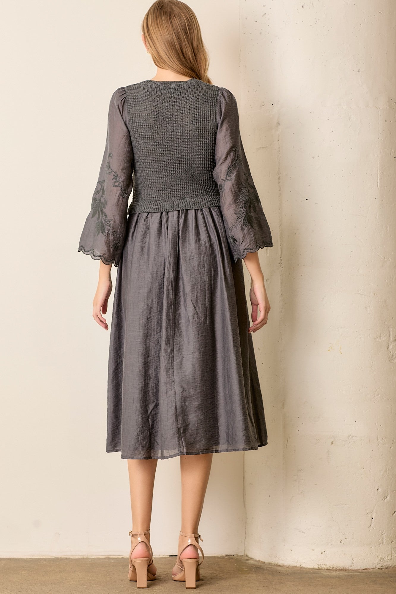 The Cynthia Dress combines comfort and style with its sweater mix fabric and elegant embroidery. Featuring a flattering V-neck and long sleeves, this dress offers both warmth and sophistication. Practical pockets add convenience, making it an ideal choice for versatile wear throughout the seasons.