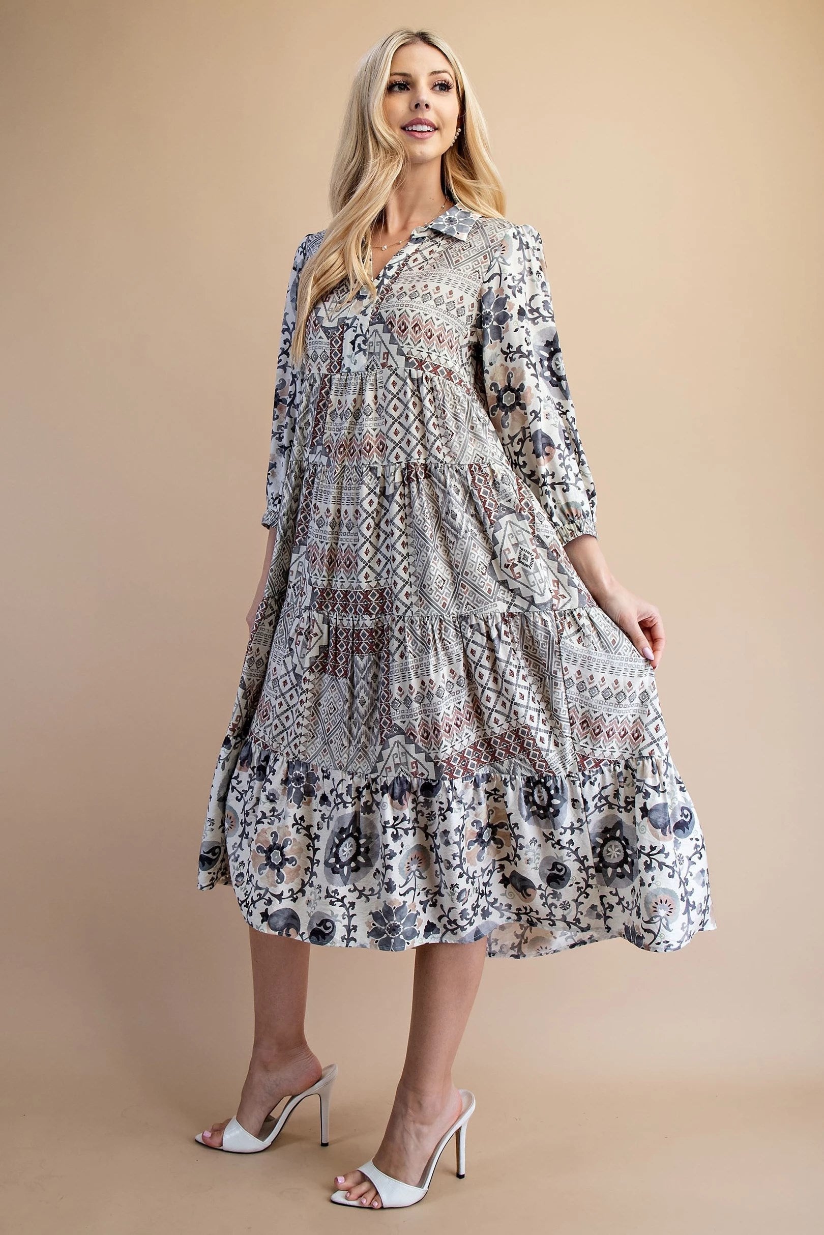 The Fern Dress features a sophisticated mixed print design and a flattering tiered midi silhouette. Its 3/4 length sleeves offer balanced coverage, making it ideal for transitional seasons. Crafted to combine style and comfort, this dress effortlessly elevates your wardrobe with a refined yet relaxed aesthetic.