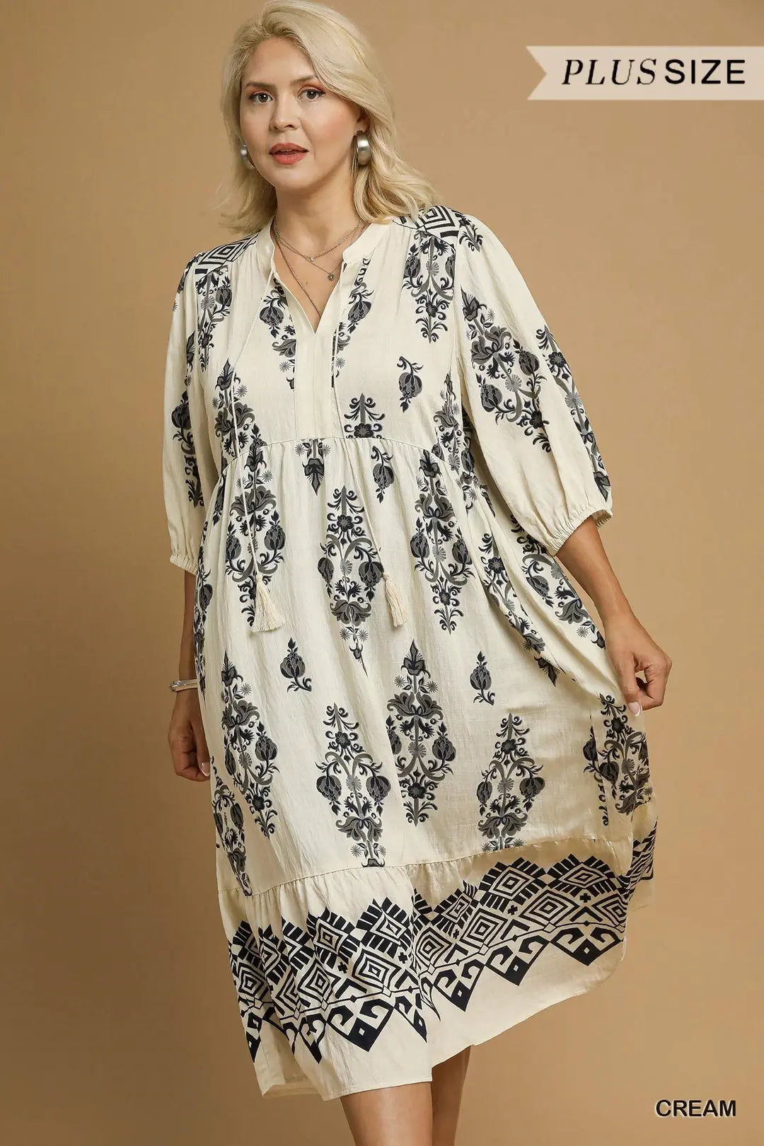 The Gabriella Dress features a sophisticated abstract print and a flattering midi length, perfect for versatile styling. Its 3/4 length puff sleeves add a refined volume, while the front tassel tie offers adjustable detailing for a customized fit. Crafted without lining, this dress delivers a lightweight and breathable wear ideal for layering or warm weather.