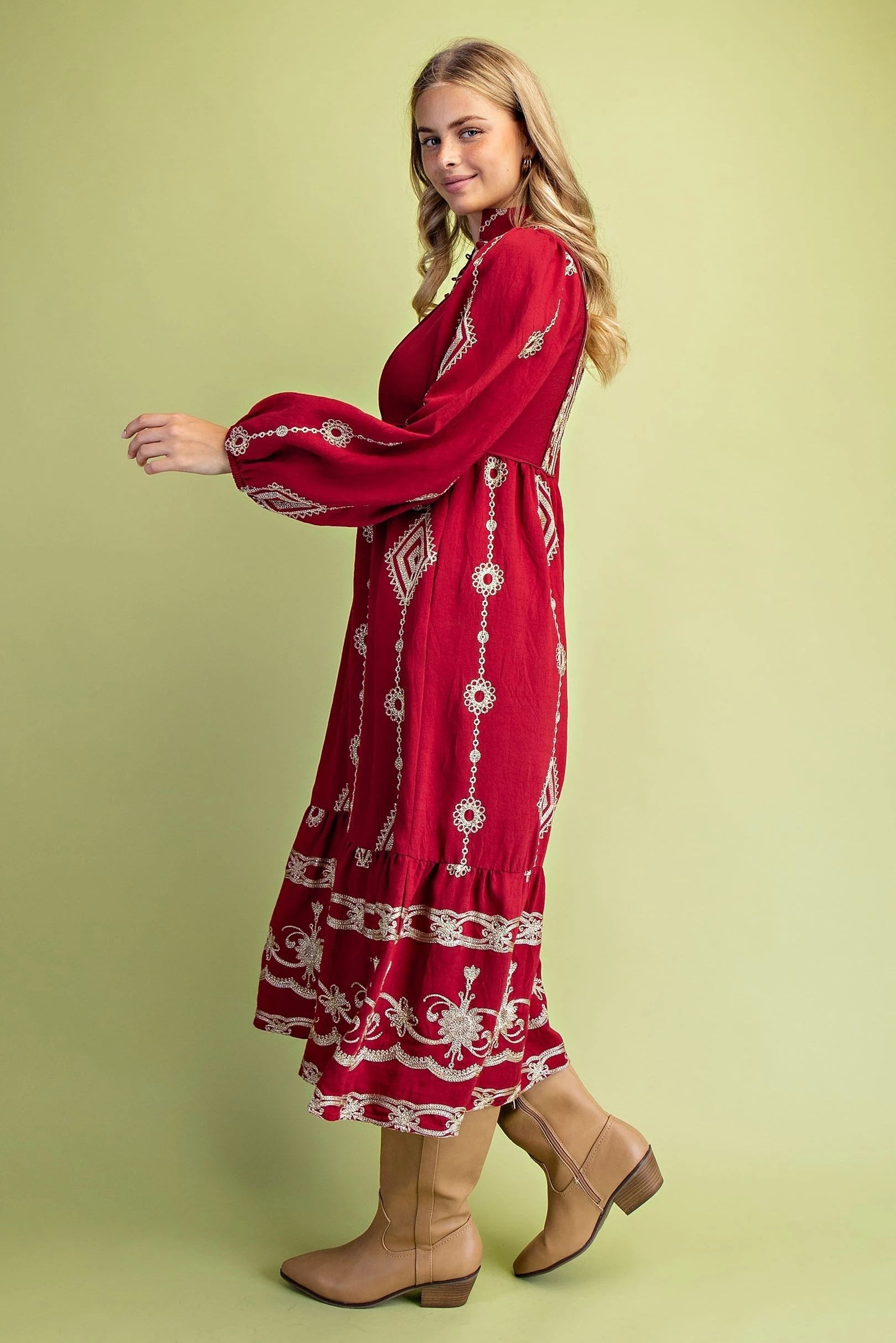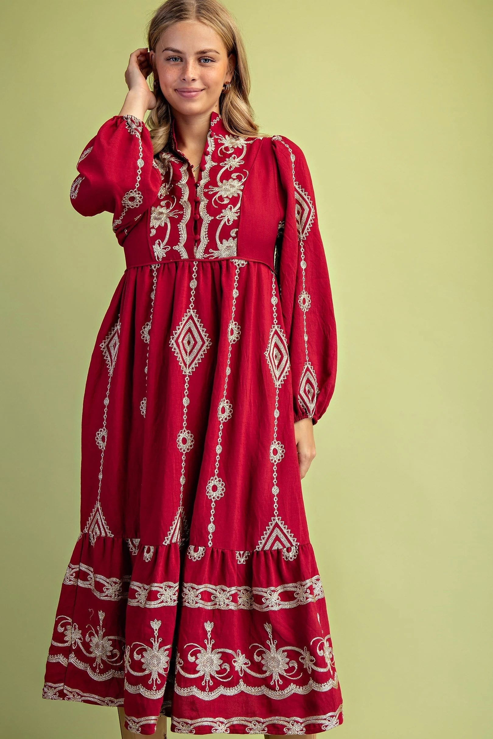 The Harper Dress combines elegance with intricate detail, featuring a buttoned V-neckline that enhances sophistication. Delicate metallic embroidery adds a refined shimmer, elevating the dress’s aesthetic. Its midi-length skirt is fully lined for comfort and smooth wear, making it ideal for formal occasions or upscale events. Crafted to balance structure and grace, this dress offers both style and ease throughout the day or evening.