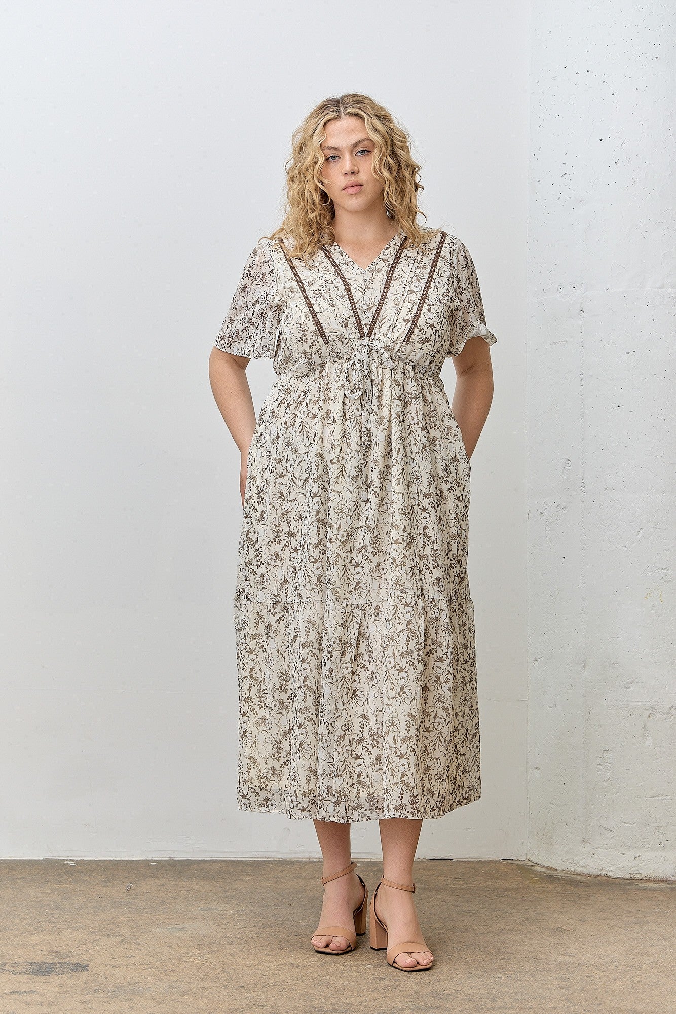 The Janae Dress combines comfort and style with its elastic waist and tiered skirt, providing a flattering fit for plus size figures. Eyelet trim details add a delicate touch, while convenient side pockets enhance functionality without sacrificing design. This dress is thoughtfully tailored exclusively for plus size wearers, ensuring both ease and elegance.