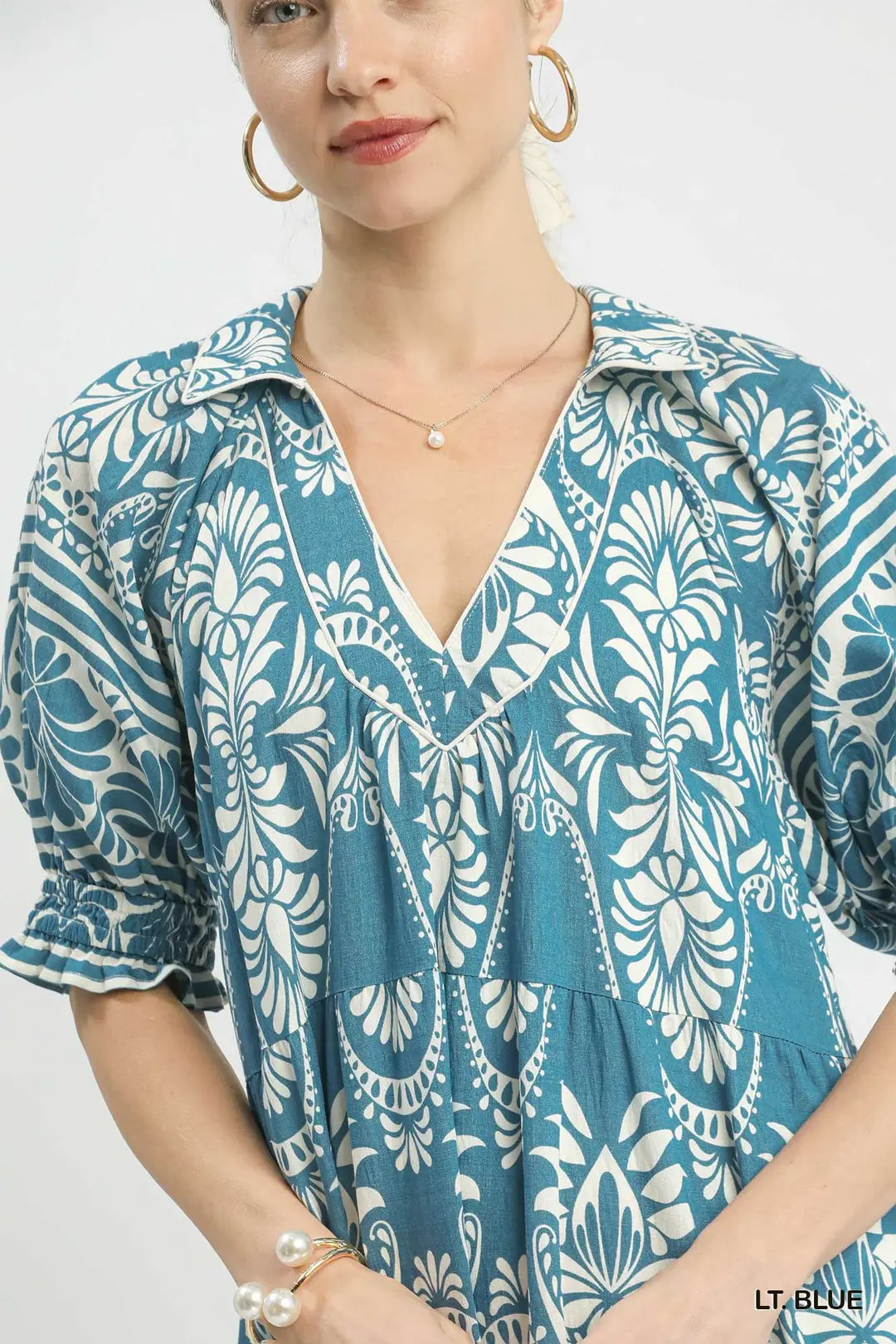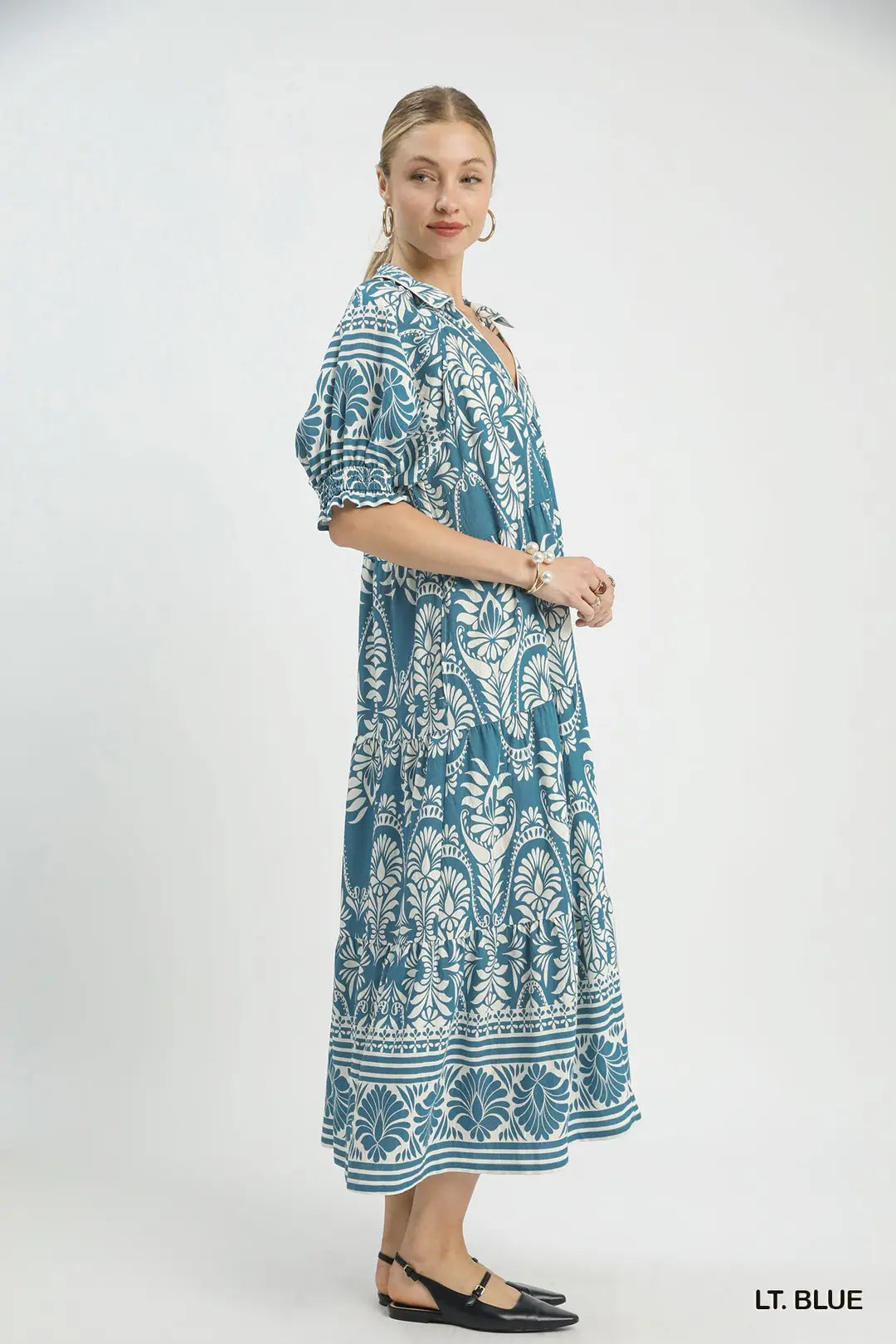 The Jordan Dress brings effortless elegance with its two-tone border print design. This tiered midi silhouette features a flattering V-neck with soft collar, romantic puff sleeves, and contrast binding details that add visual interest. The unlined construction offers breathable comfort for warm-weather wear. Perfect for casual outings or dressed-up occasions, this versatile piece transitions seamlessly from day to night.