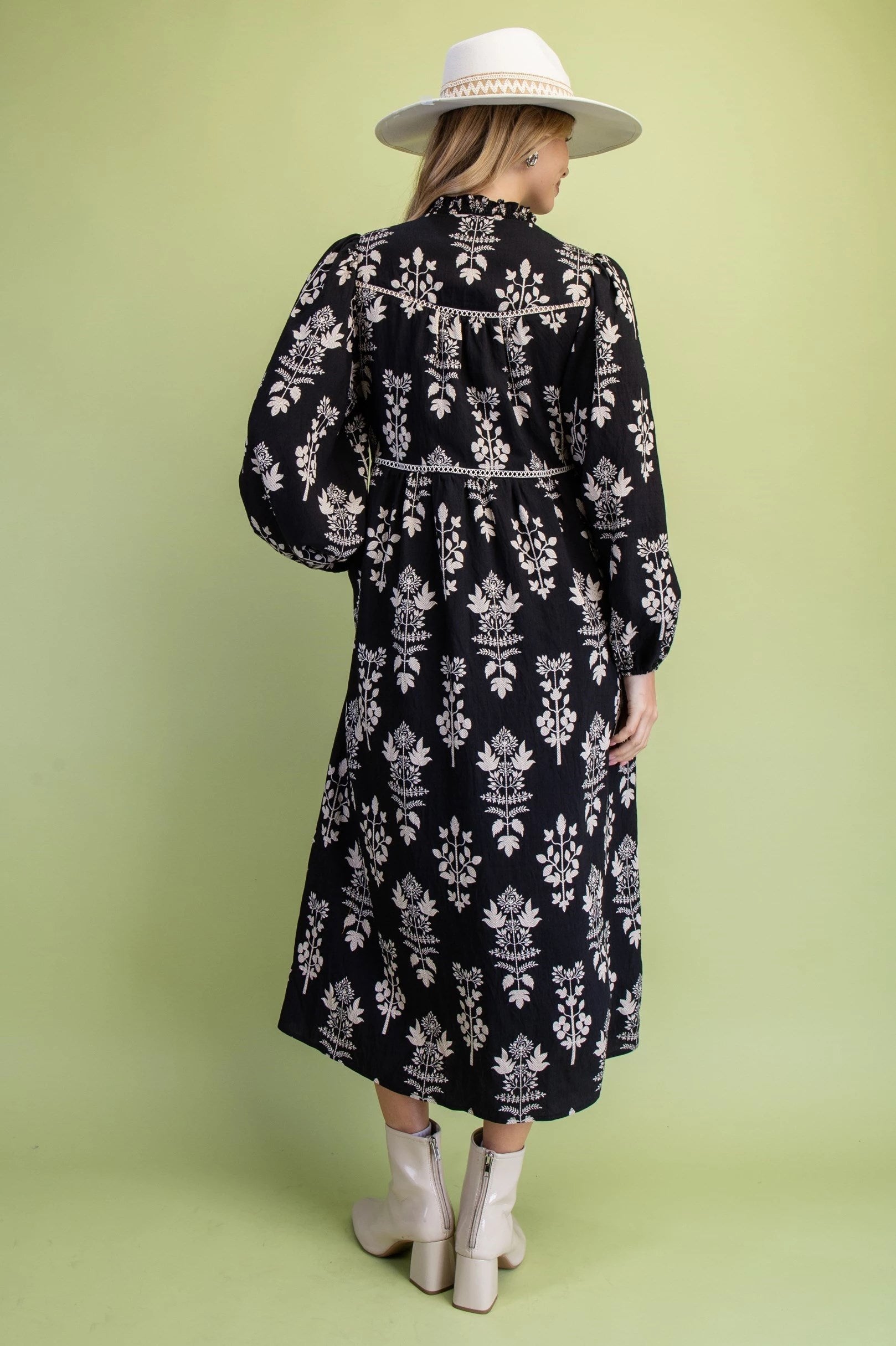 The Luna Dress features a delicate floral print and a smocked neckline that offers a comfortable, flattering fit. Its midi length is complemented by subtle trim details, adding refined texture and sophistication. Fully lined for added comfort and coverage, this dress combines elegance with wearability, making it an excellent choice for both casual and special occasions.