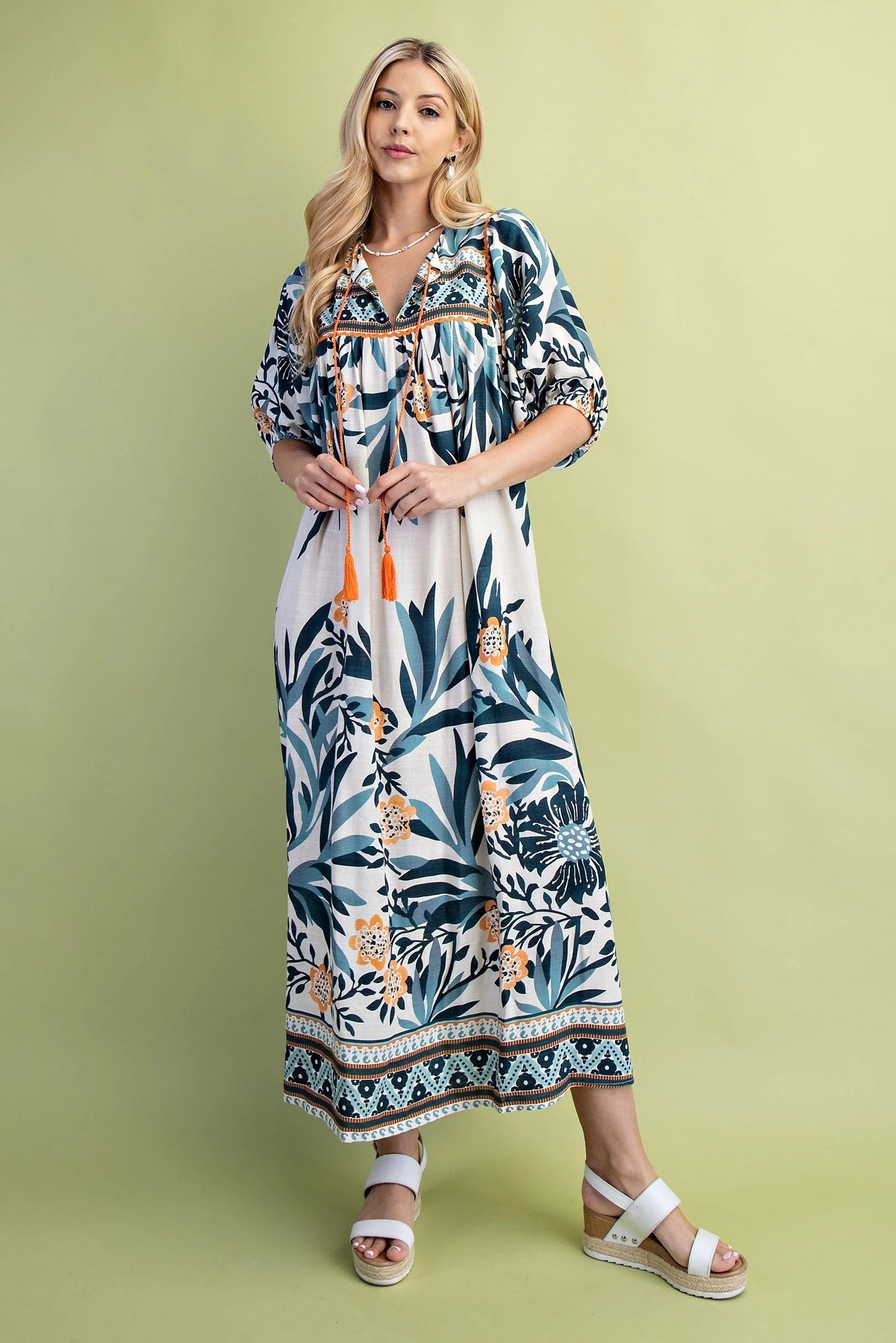 The Mel Dress is a sophisticated midi-length garment featuring a delicate printed pattern that adds subtle charm. It is designed with a tassel neck tie for adjustable styling and a touch of bohemian elegance. Ric-rac trim details enhance the dress’s silhouette, providing a refined finish that elevates its overall appeal. Perfect for both casual and semi-formal occasions, this dress combines classic design elements with expert craftsmanship for a versatile wardrobe staple.