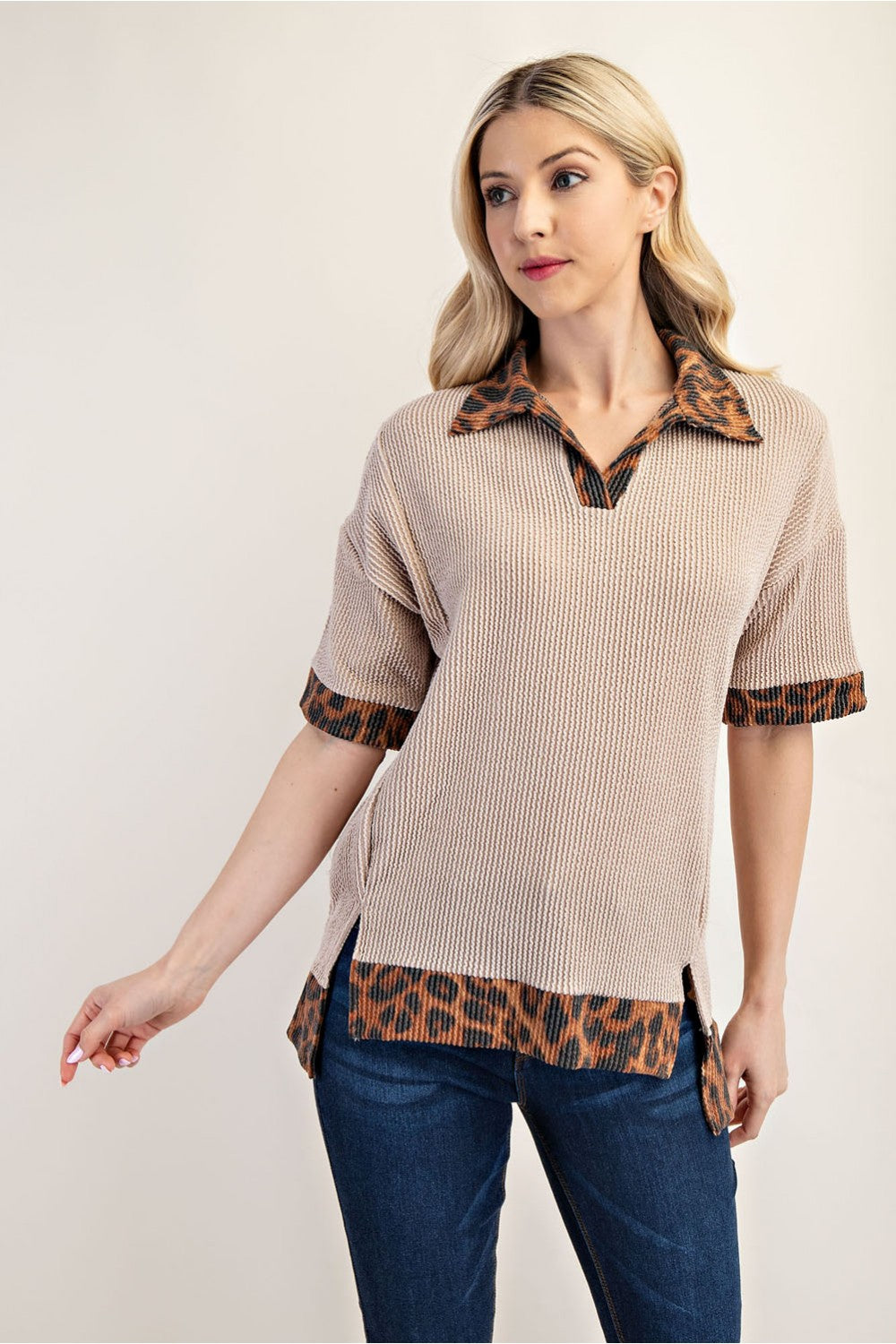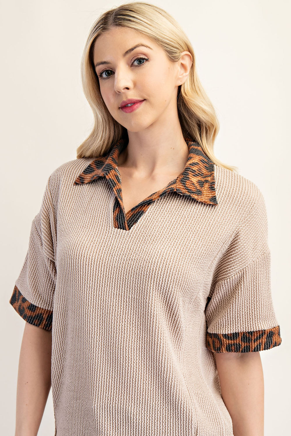 | Stand out with confidence in this CLASSIC ANIMAL PRINT Collar Top, where bold fashion meets casual comfort. Crafted from a lightweight waffle knit fabric, The relaxed fit and short sleeves provide an effortlessly chic look, while the side slits add an element of versatility for layering or movement. 77% POLYESTER 18% RAYON 5% SPANDEX |