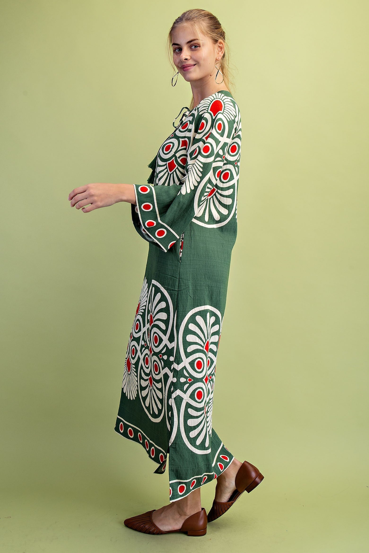The Sophia Dress features a flowing wide sleeve design and a delicate tassel tie at the neck, adding subtle elegance to its printed fabric. Fully lined for comfort and quality, this dress offers a polished look while ensuring breathable wear. Its graceful silhouette combines style and ease, ideal for both casual and refined occasions.